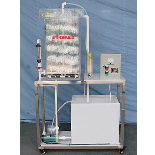 生物接触氧化是生物膜法的一种主要设施,又称为淹没曝气式生物滤池。池内设定填料,填料淹没在废水中,池底放置曝气装置,空气来自气泵。本装置是生物接触氧化塔的展览和教学演示设备。经过本实训希望达到以下目的: